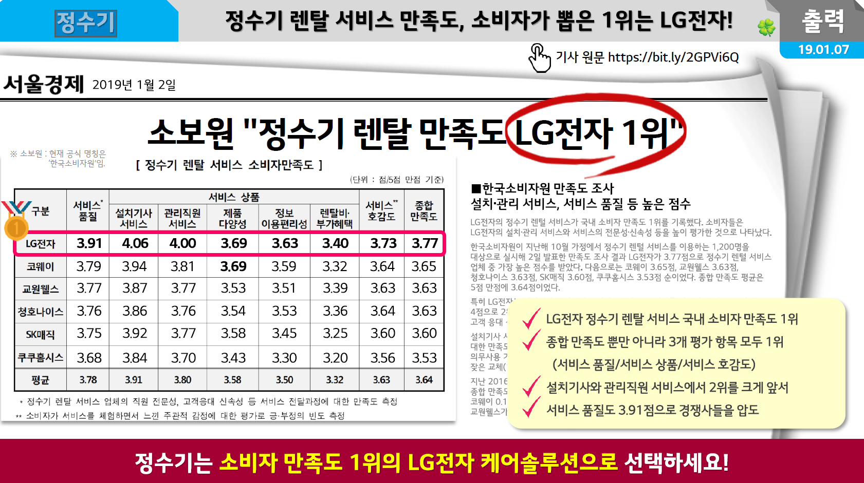 소보원 "정수기 렌탈 만족도 LG전자 1위"